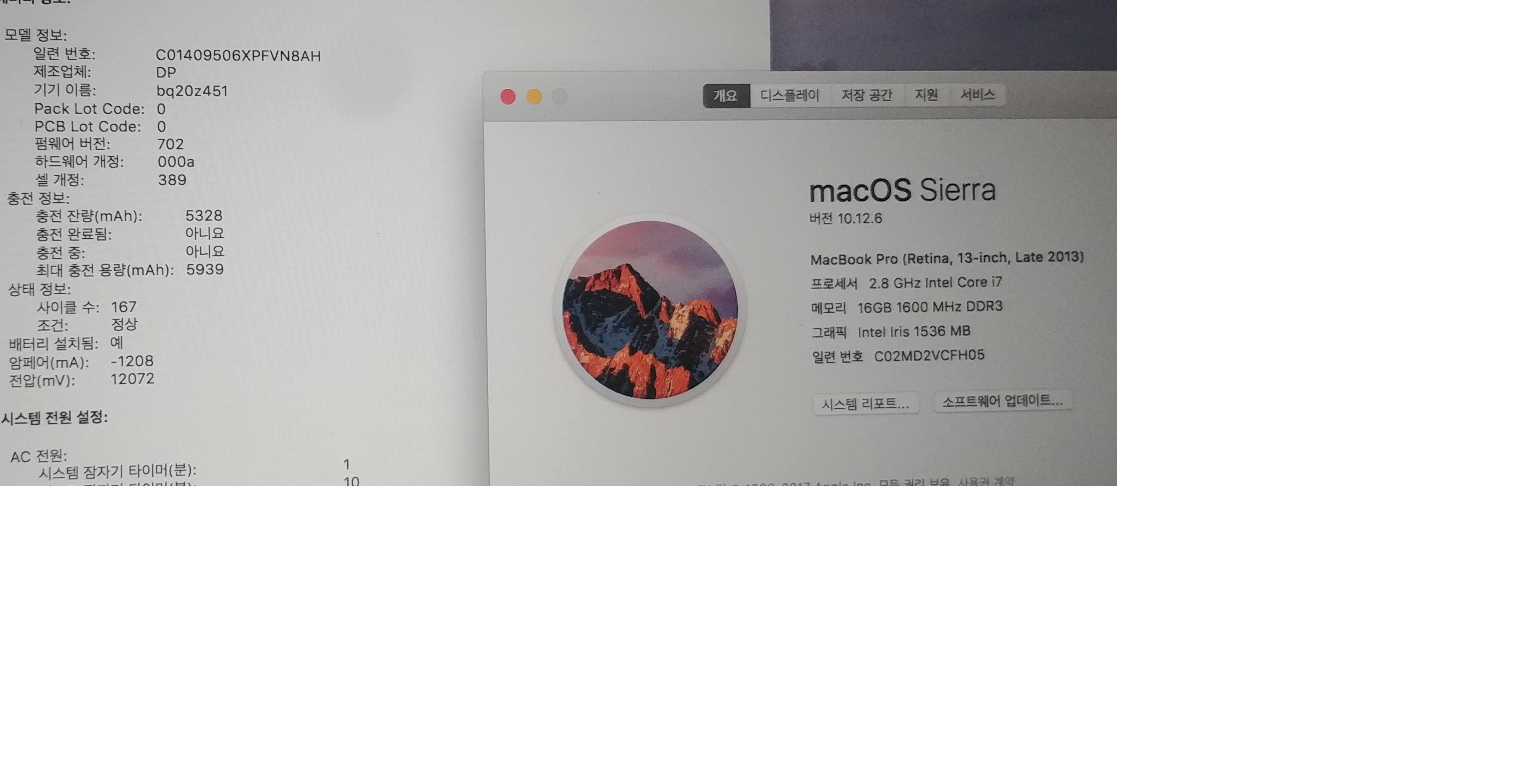 배터리 사이클 167 최대충전용량 5939
