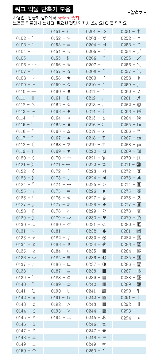 대충 외워서 쓰구요,,,대표문자로 해서리 사용하심 편합니다... 예를들면 세모에 관한건 OPTION+S, 네모에 관한건 OPTION+A, 동그라미에 관한건 OPTION+D, 기타 마니쓰는건 OPTION+F, 화살표에 관한건 OPTION+Z,X,C 일케 외워두시면 몇가지 안외우고도 마니 쓸수 있다는거,,, 참, OPTION+A하시면 A가나온상태에서 COMMAND+RETURN을 치심 나와요,,, 글구 저걸로 못찾는건 기억해야죠,,, 따옴표 한개짜리는 0114, 0115 두개짜리는 0116,0117 꺽쇠 한개짜리는 0124, 0125 두개짜리는 0126, 0127 글구 느낌표 하나짜리 누워있는건 1316(참고로 요것이 약물표중 가장 마지막번호,,,ㅋ)